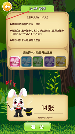 3、找卡片功能的規則頁,說明2-5人參與的游戲流程,提供卡片數量選擇,選后點準備即可進入游戲。