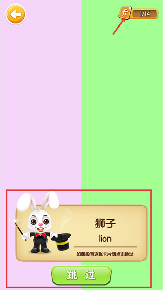 4、找卡片游戲的對局頁,顯示卡片進度,呈現獅子對應的卡片名稱,設跳過按鈕,推進找卡互動流程。