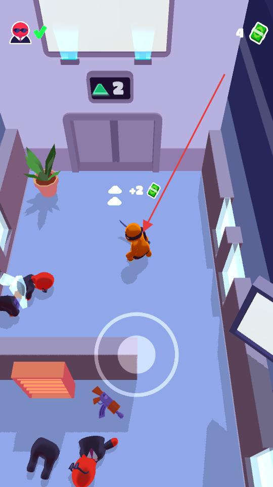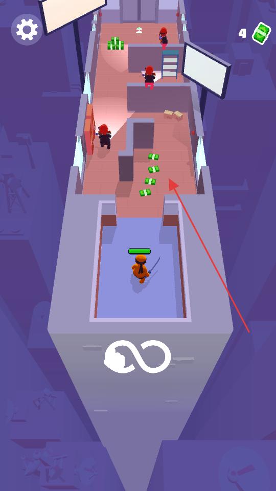 4、清理完一層的敵人并收集好鈔票后,前往通往上層的區域,進入新的場景,會面對更多敵人和鈔票,繼續重復刺殺與收集的操作,推進游戲的關卡。