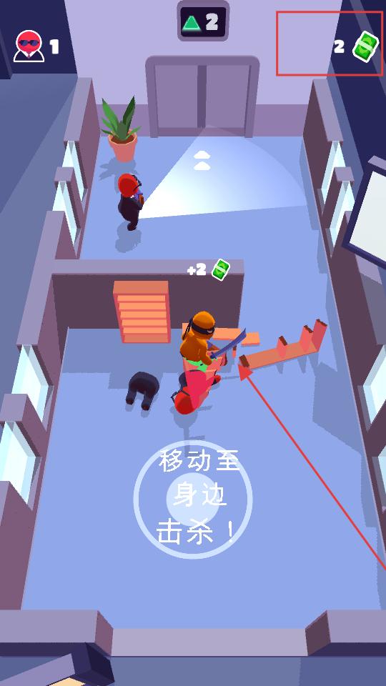 2、靠近紅色敵人后,會觸發刺殺機制,成功擊倒敵人能得到綠色鈔票獎勵,同時要留意場景中其他敵人的位置,防止被他們發現。
