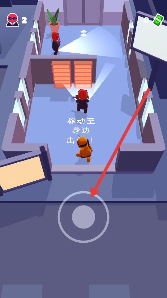 1、操控角色時點擊屏幕下方的圓形移動按鈕,使角色在場景里移動,慢慢靠近持有武器的紅色敵人,準備開展刺殺動作,借此推動游戲的進程。