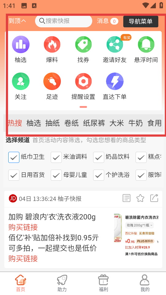 1、首頁頂部有搜索欄可搜快報,還有消息和導航菜單按鈕,下方有柚選、爆料等多種功能入口能滿足不同需求,根據喜好勾選頻道,篩選想看的商品類型。