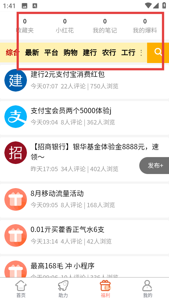 3、福利頁面頂部顯示收藏夾、小紅花等個人相關數據,下方有綜合、最新等分類標簽,還有平臺、購物等細分類別,方便篩選不同類型的福利內容。