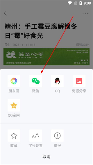 4、在詳情頁面點擊更多按鈕選擇朋友圈微信等分享渠道,也可選擇收藏功能,將文章內容留存備用。
