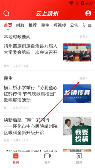 1、打開云上靖州進入首頁瀏覽時政民生等分類內容,查看本地時政新聞及民生資訊,點擊民生板塊的更多按鈕,進入民生資訊列表頁面。