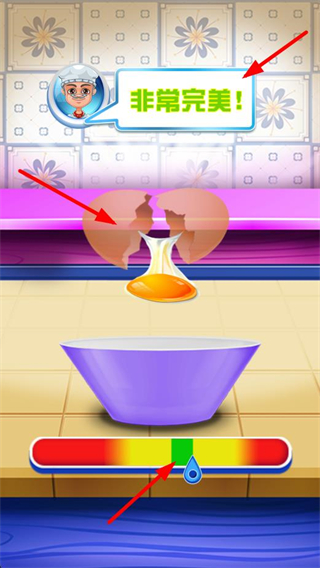 1、在食材處理環節,抓住時機完成雞蛋的處理操作,界面會提示非常完美,這一步是菜品制作的基礎流程,助力后續步驟。