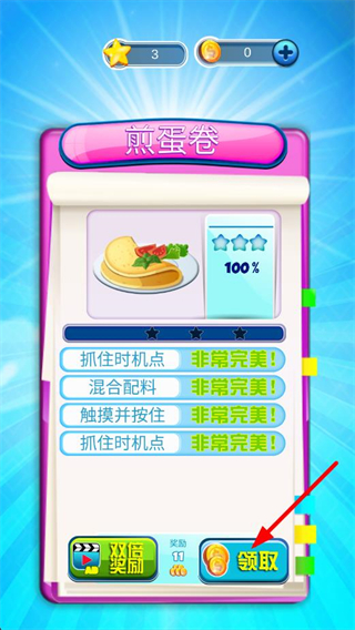 3、完成煎蛋卷的所有制作步驟后,界面顯示各環節評價為非常完美,點擊領取按鈕獲取對應的獎勵,積累資源。