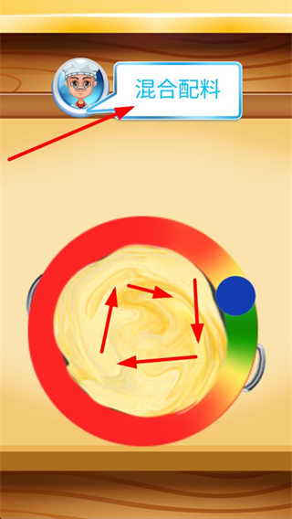 2、按照提示進行混合配料操作,操控對應元素攪動配料,完成這一步的制作流程,讓配料充分融合以推進菜品制作。