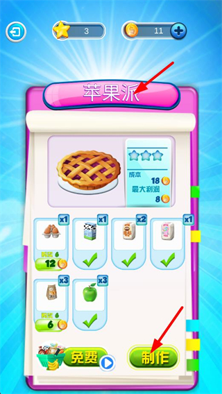 4、選擇蘋果派菜品,確認所需食材已備齊后,消耗對應資源點擊制作按鈕,開啟蘋果派的制作流程,豐富菜品類型。