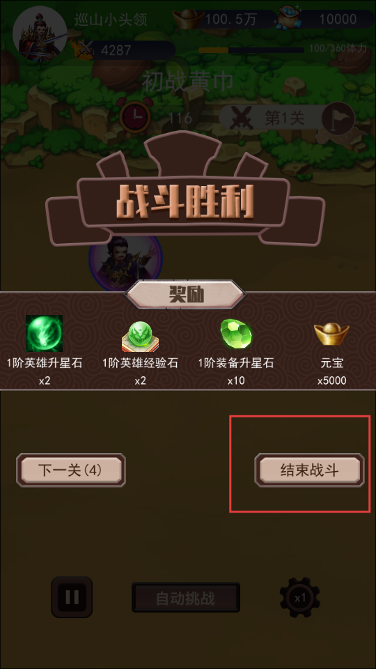 3、戰斗勝利后,會獲得升星石、經驗石等獎勵,可點擊結束戰斗結算,也能選擇挑戰下一關。