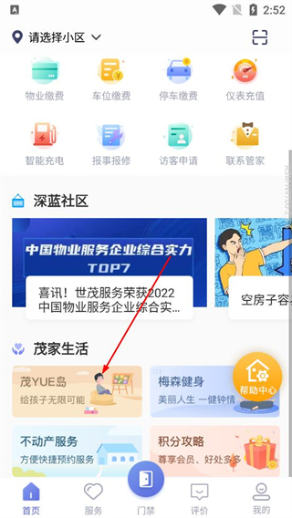 2、注冊完成后進入首頁,瀏覽頁面中的功能板塊,找到深融社區里的茂家生活區域,點擊對應的茂YUE島相關內容,進入詳情頁面。