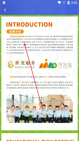 3、在詳情頁面查看世茂服務的品牌介紹,了解企業相關信息,繼續向下瀏覽頁面內容,找到托育課程介紹的板塊。