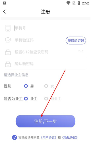 1、進入注冊頁面,填寫手機號獲取驗證碼,設置登錄密碼并確認,選擇業主信息與性別,勾選協議后點擊注冊下一步,完成賬號注冊。