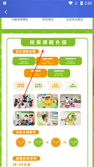 4、查看托育課程介紹里的五大課程主題、分齡小班教學等內容,了解課程相關安排,完成對該板塊信息的瀏覽。