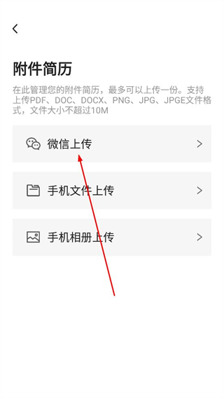 4、在附件簡歷頁面選擇微信上傳等方式,按照提示上傳簡歷文件,支持多種格式且不超過10M,完成上傳后即可完善簡歷信息。