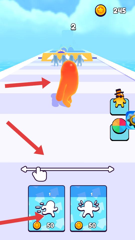 1、進入游戲,操控橙色果凍人在跑道上前進,可使用下方道具,花費50金幣能獲得不同效果,助力跑酷。
