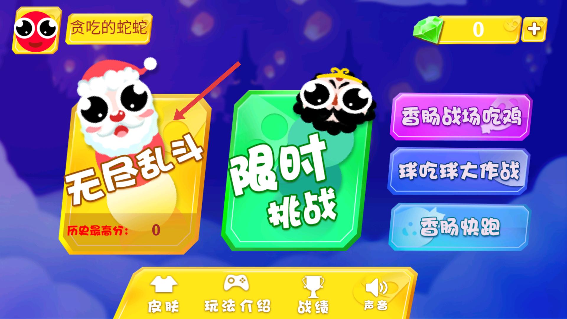 1、游戲初始界面,選擇無盡亂斗模式,進入游戲開啟貪吃蛇的挑戰,在該模式下可盡情體驗蛇蛇成長的樂趣。