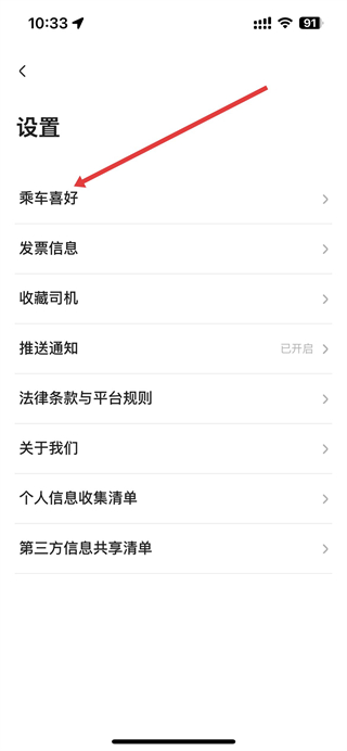 3、進入設置界面,有乘車喜好、發票信息等多個選項,點擊乘車喜好選項,進入乘車偏好的設置界面。