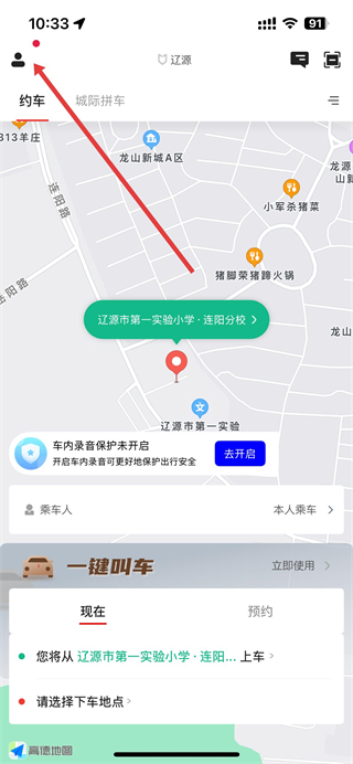 1、進入約車界面,地圖呈現定位區域及上車點提示,點擊左上角入口,可展開包含行程、錢包等選項的功能側邊欄。