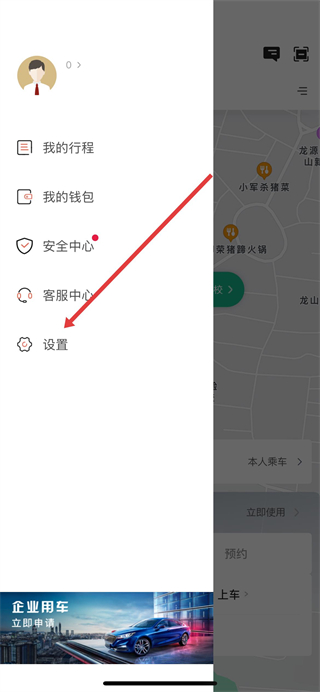 2、展開側邊欄后,能看到我的行程、設置等功能選項,點擊設置選項,進入對應的設置操作界面。