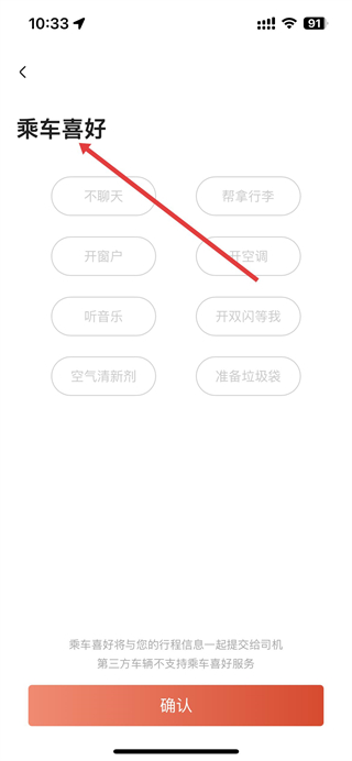 4、進入乘車喜好界面,可選擇不聊天、幫拿行李等偏好,選定后點擊確認按鈕,完成乘車喜好的設置流程。