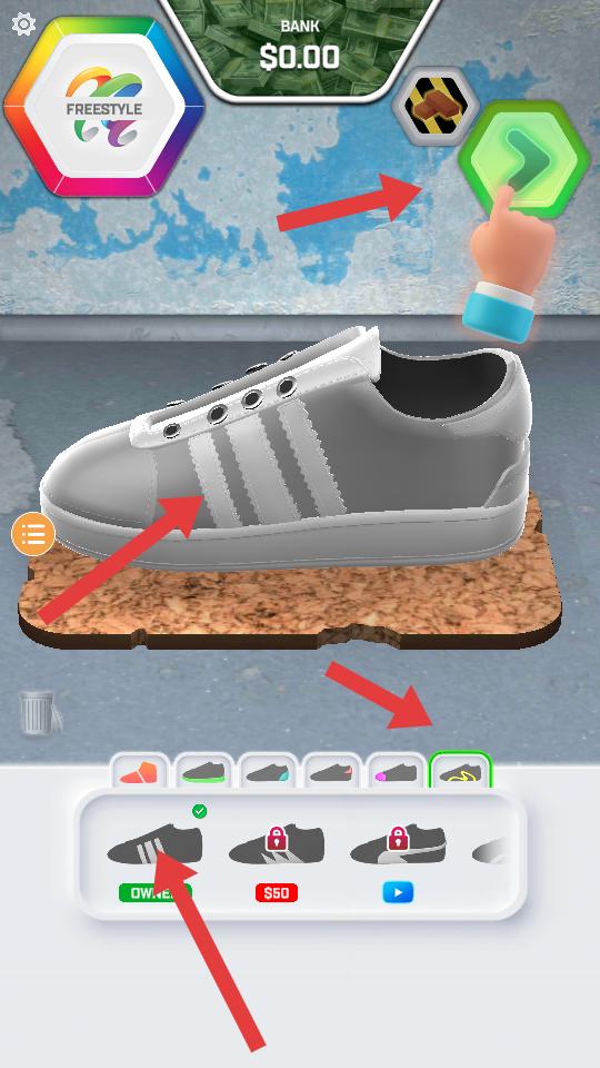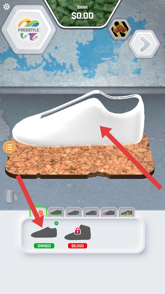 2、選擇球鞋款式,能看到白色球鞋模型,下方可挑選已擁有或需花費5000美元購買的鞋款,為定制選基礎款。