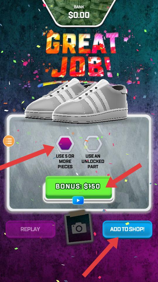 4、完成球鞋定制后,界面顯示GREAT JOB,可獲得150美元獎勵,還能點擊ADD TO SHOP將定制球鞋加入商店。