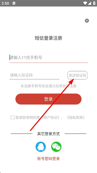 4、進入短信登錄注冊頁面,輸入11位手機號后點擊發送驗證碼,填寫驗證碼并勾選協議,點擊登錄即可完成操作,未注冊手機號會自動注冊。