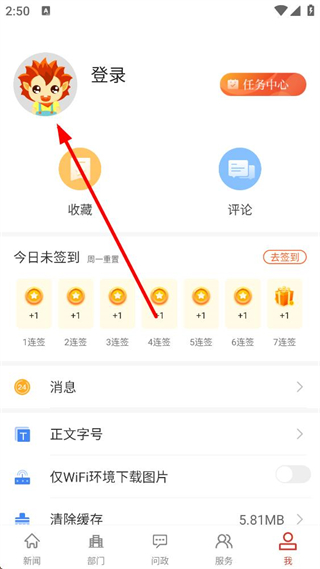 2、進入我的頁面,能看到登錄按鈕及收藏評論等功能,還有簽到模塊與各類設置項,點擊登錄按鈕,可進入登錄相關界面。