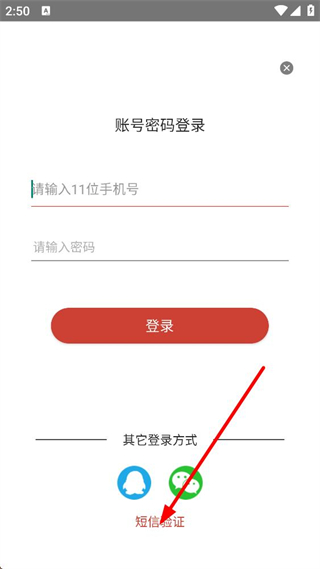 3、進入賬號密碼登錄頁面,可輸入手機號和密碼登錄,也能選其它登錄方式,同時可切換至短信驗證的登錄注冊方式。