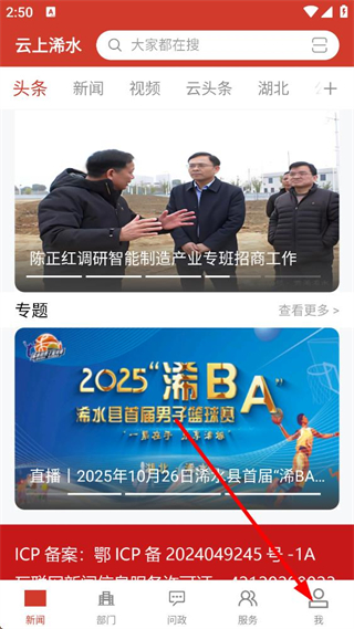 1、進入云上浠水主頁面,可看到頭條新聞專題等內容,底部設新聞部門等功能欄,點擊我的選項,即可進入個人相關操作頁面。