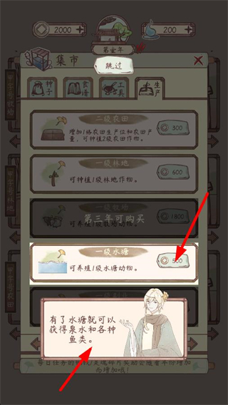 1、在集市購買一級水塘,有了水塘可獲得泉水和各種魚類,拓展養殖經營項目,豐富資源獲取渠道。