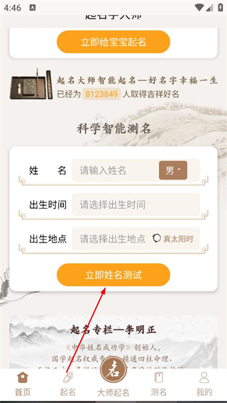 1、進入起名字大師,在科學智能測名板塊填寫姓名出生時間出生地,選擇性別后點擊立即姓名測試,可獲取姓名相關測評結果。