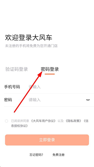 2、切換至密碼登錄選項,輸入已綁定的手機號碼及對應密碼,勾選協議后點擊立即登錄,也可完成賬號登錄流程。