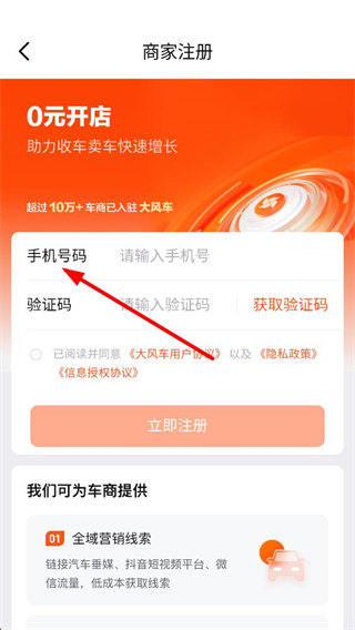3、進入商家注冊頁面,輸入手機號碼并獲取驗證碼,勾選協議后點擊立即注冊,即可完成0元開店的商家賬號注冊。