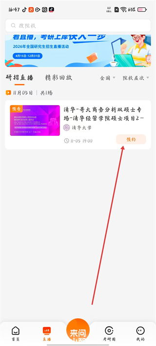 2、在研招直播頁面可查看清華-哥大商務分析碩士專場等直播,點擊預約可預約該直播,以便及時觀看獲取考研信息。