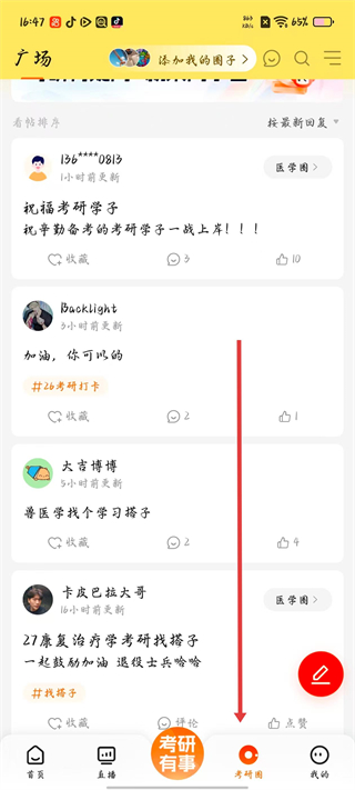 3、進入考研圈頁面可查看祝??佳袑W子、加油你可以的等考研動態,了解其他考研學子的備考狀態,還可參與評論互動。