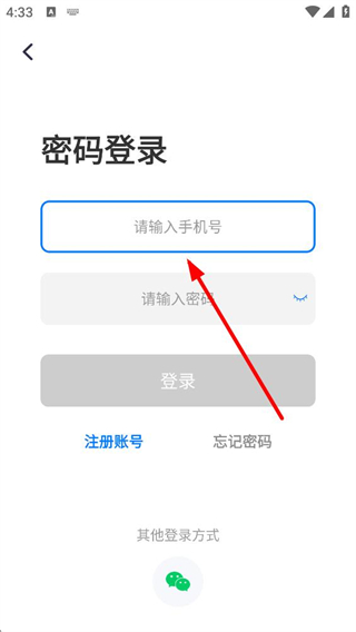 4、進入密碼登錄界面,設有請輸入手機號請輸入密碼輸入框,搭配登錄按鈕,還有注冊賬號忘記密碼選項,可填信息完成登錄流程。