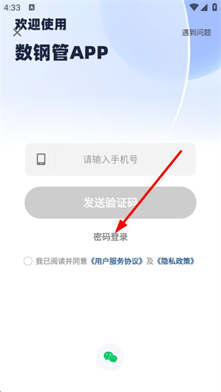 3、進入登錄界面呈現歡迎使用數鋼管APP字樣,設請輸入手機號輸入框,還有發送驗證碼密碼登錄選項,需先勾選協議再推進后續步驟。