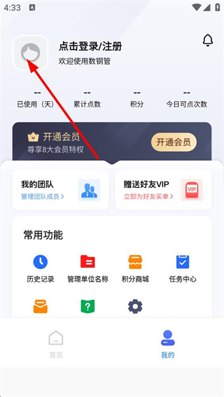 2、點擊我的進入對應界面,顯示點擊登錄、注冊提示,還有已使用天數等信息,常用功能區包含歷史記錄等選項,可開展登錄相關操作。