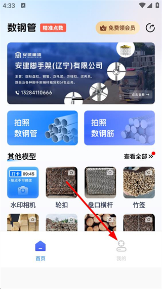 1、進入界面可見數鋼管精準點數標識,還有免費領會員按鈕,配備拍照數鋼管拍照數鋼筋功能,其他模型板塊含輪扣等選項,可擇功能啟動操作。