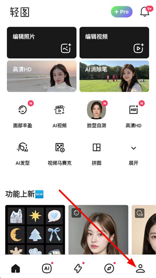 1、進入輕圖首頁,可見編輯照片、編輯視頻等功能,還有高清HD、消除筆等工具選項,點擊底部個人中心,進入對應頁面。