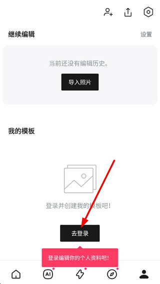 2、進入個人中心頁面,顯示無編輯歷史,我的模板需登錄創建,點擊去登錄按鈕,進入登錄選擇的操作界面。