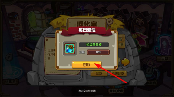 3、孵化時可進行每日灌注,使用初級營養液等,點擊灌注按鈕,助力寵物孵化成長。