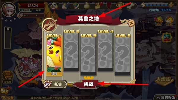 4、挑戰莫魯之地等場景,如挑戰奶雞所在的LEVEL1,點擊挑戰按鈕,讓寵物參與戰斗。