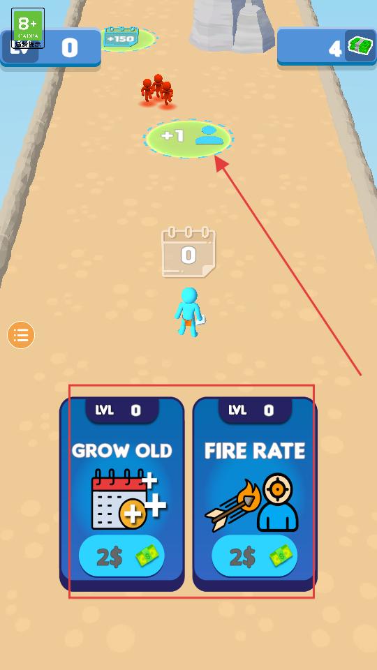 1、操控藍色小人移動到場景加1的人員增益區域,同時可花費金幣選擇GROWOLD或FIRERATE等能力提升選項,增強軍團實力,為后續戰斗做準備。