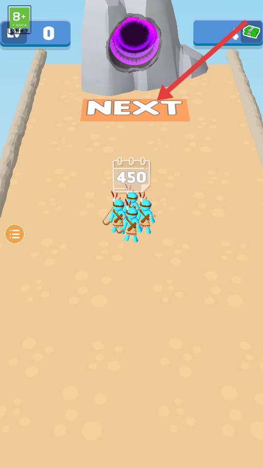 3、擊敗紅色敵人后繼續操控藍色小人軍團向場景中的紫色傳送門方向移動,到達傳送門前,點擊NEXT標識,準備進入下一段場景或挑戰。