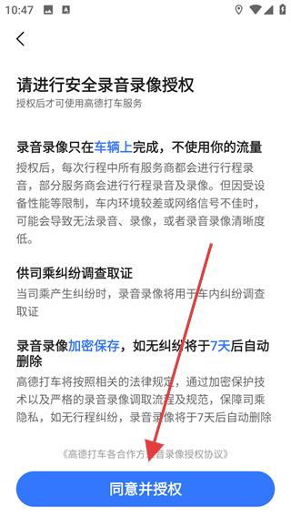 1、打開高德地圖APP,若使用高德打車服務,需進行安全錄音錄像授權,點擊同意并授權,完成權限確認。