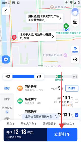 3、選擇好目的地后確認上車點為我的位置上車,然后瀏覽可選車型,如特價拼車、極速拼車等,選擇合適車型。