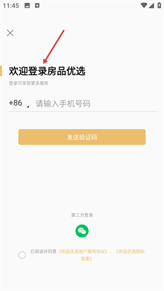 1、進入后看到房品優選的登錄界面,輸入手機號碼并發送驗證碼,勾選協議完成登錄,開啟后續的看房操作流程。